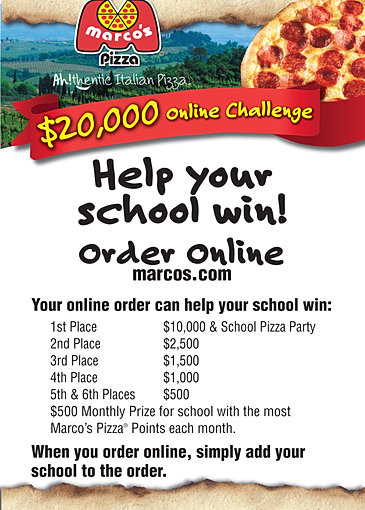 Order ONLINE any day of the week and we earn points! NEW this year, we can earn points also on our Marco's Pizza Night for phoned in orders. Please still try and order ONLINE on Marco's Pizza Night because we earn double the points for online orders as phoned in orders. ... Return Document